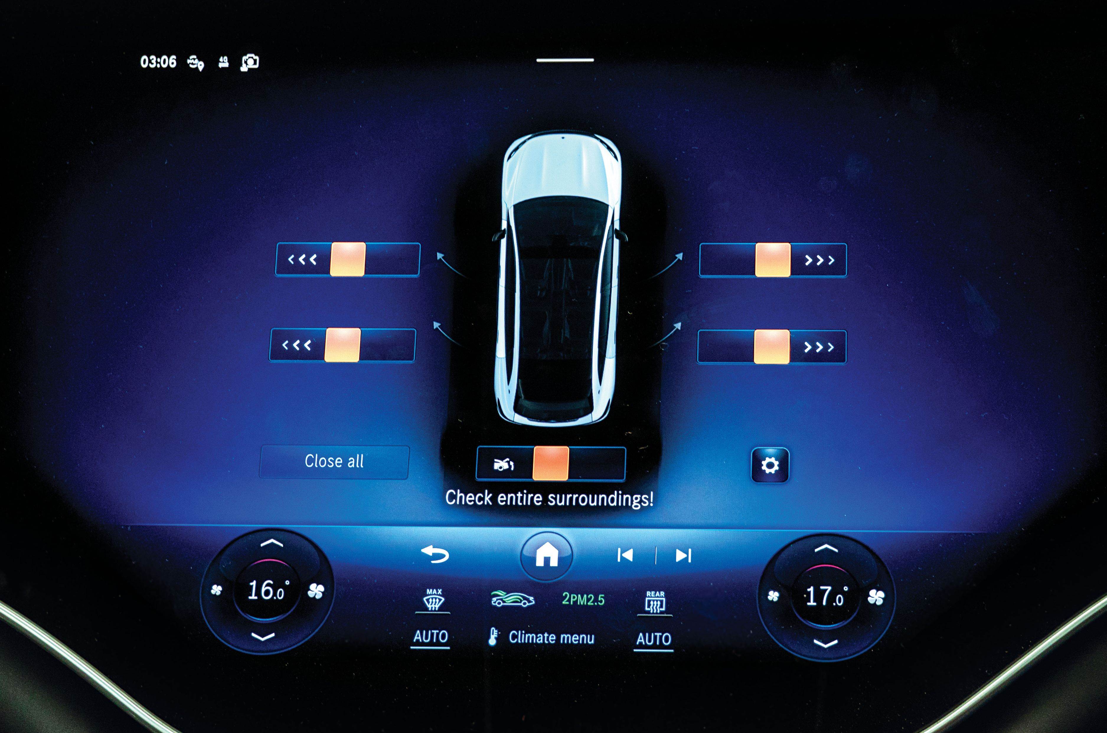 15-speaker Burmester 4D sound system and screen-operable doors.