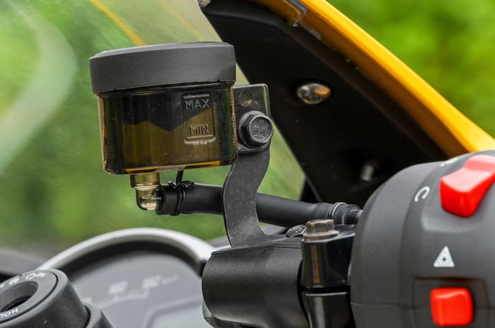 The bike also has a redesigned tail section with a pillion seat cowl, a new grab rail, rectangular LED taillight, and shorter mudguard compared to the Speed 400. To accommodate a pillion, the cowl can be removed by unscrewing two bolts after opening the single-piece seat. The bike misses out on golden coloured forks compared to the Speed 400, but a nice touch is the new oil reservoir cup.