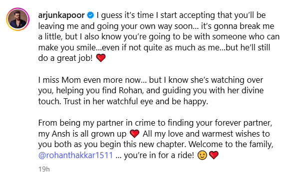 वहीं, अर्जुन ने रोहन को लेकर लिखा, “मेरी पार्टनर इन क्राइम होने से अपने फोरएवर पार्टनर को पाने तक तक, मेरी अंशुला अब बड़ी हो गई है। आप दोनों को इस नए चैप्टर के लिए मेरी शुभकामनाएं। परिवार में स्वागत है, रोहन ठक्कर अब तुम्हारे लिए नए अनुभव शुरू हो रहे हैं।”
