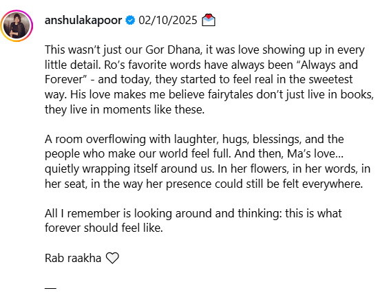 वहीं, सगाई के बाद अंशुला ने अपनी पोस्ट में लिखा, “यह सिर्फ हमारा गोर धाना नहीं था, यह हर छोटी चीज में प्यार दिखा रहा था। रो (रोहन) के फेवरेट वर्ड्स हमेशा से थे ‘’हमेशा और हमेशा के लिए’’ और आज ये सबसे प्यारे तरीके से सच लगा।”