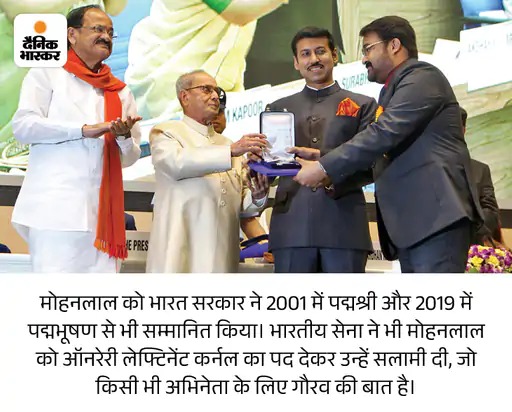 मोहनलाल को फिल्म जगत में उनके योगदान के लिए हिंदी सिनेमा के सबसे गौरवपूर्ण दादासाहेब फाल्के अवॉर्ड से सम्मानित किया गया था। राष्ट्रपति द्रौपदी मुर्मू ने उन्हें शॉल पहनाई और गोल्डन लोटस अवॉर्ड दिया था। इस दौरान मोहनलाल को स्टैंडिंग ओवेशन मिला।