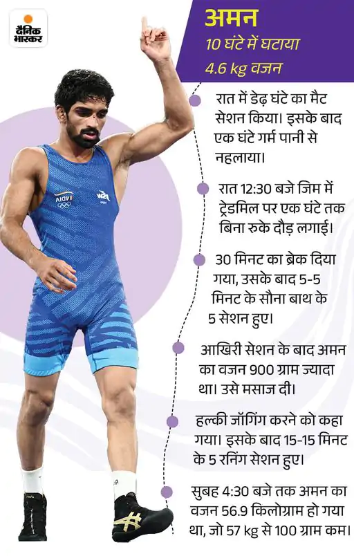 अमन पहले 10 घंटे में 4.6 kg वजन घटा चुके हैं अमन सहरावत ने पेरिस ओलिंपिक में सेमीफाइनल के बाद 10 घंटे में 4.6 kg वजन घटाया था। मैच के बाद अमन का वजन 61.5 KG हो गया था, जो उनकी वेट कैटेगरी 57 किलोग्राम से 4.5 किलो ज्यादा था, जिसे भारतीय दल ने सुबह से पहले कम किया था। भारतीय कोच वीरेंद्र दहिया ने उनके वजन घटाने का प्रक्रिया बताई थी।