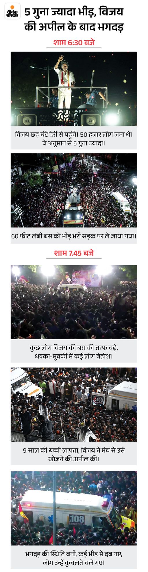विजय की पार्टी तमिलगा वेट्री कजगम यानी TVK की रैली में बड़ी संख्या में लोग पहुंचे थे। जिसमें 9 साल की एक बच्ची गुम गई थी। विजय ने मंच से उसे तलाशने की अपील पुलिस और अपने लोगों से की, जिसके बाद वहां भगदड़ जैसे हालात बन गए।