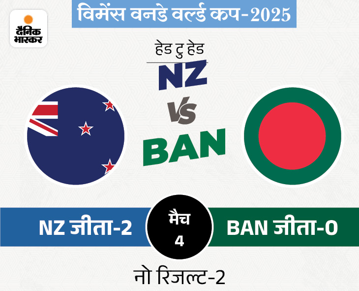 वर्ल्ड कप में दूसरी बार होगा सामना न्यूजीलैंड और बांग्लादेश के बीच 4 विमेंस वनडे खेले गए। इनमें से 1 न्यूजीलैंड ने जीते। जबकि 2 मुकाबलों का रिजल्ट नहीं निकल सका। वनडे वर्ल्ड कप में दोनों के बीच 1 मैच खेला गया है। 2022 में खेला गया यह मुकाबला न्यूजीलैंड ने 9 विकेट से जीता।