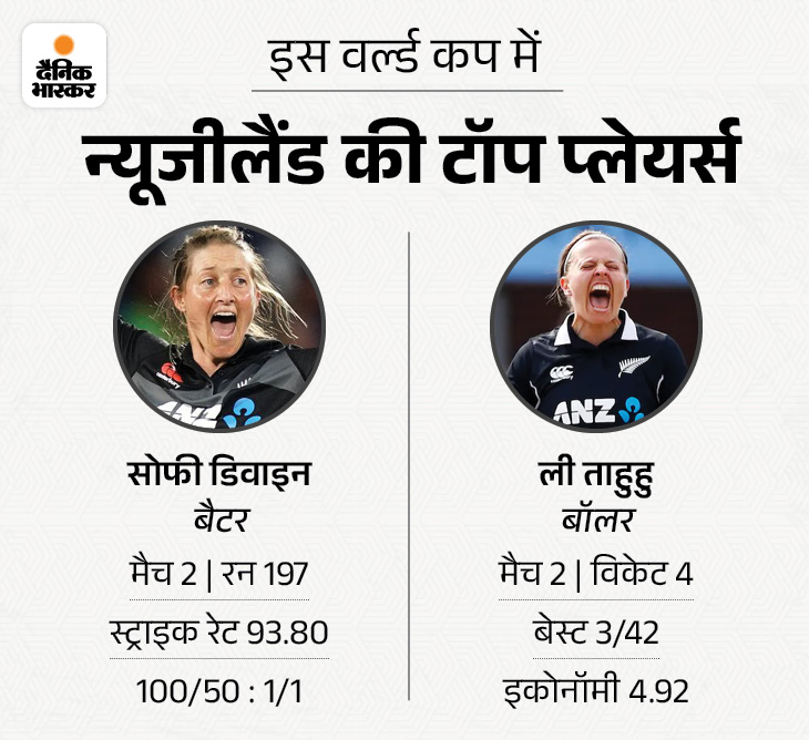 बॉलिंग में ली ताहुहु टॉप पर न्यूजीलैंड की कप्तान सोफी डिवाइन को छोड़कर बाकी सभी बैटर फ्लॉप रही है। सोफी ने पहले मैच में ऑस्ट्रेलिया के खिलाफ शतक और दूसरे में साउथ अफ्रीका के खिलाफ अर्धशतक लगाया था। वहीं, बॉलिंग में ली ताहुहु टॉप पर हैं।