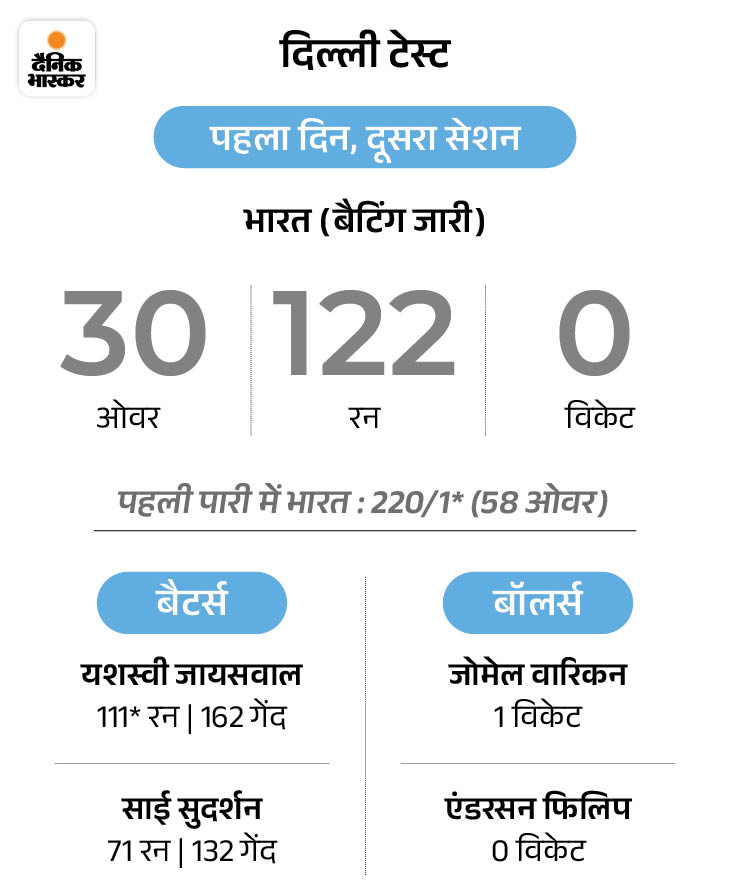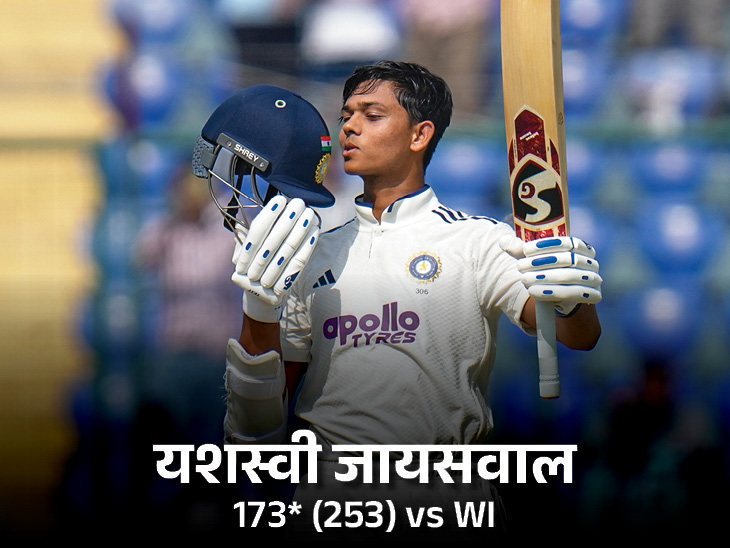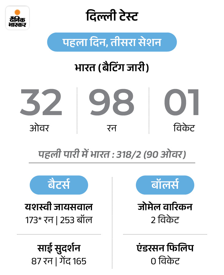 दिल्ली टेस्ट के पहले ही दिन भारत ने वेस्टइंडीज के खिलाफ मजबूत पकड़ बना ली है। अरुण जेटली स्टेडियम में शुक्रवार को स्टंप्स तक टीम ने महज 2 विकेट खोकर 318 रन बना लिए। यशस्वी जायसवाल 173 और शुभमन गिल 20 रन बनाकर नॉटआउट लौटे। यह यशस्वी का वेस्टइंडीज के खिलाफ बेस्ट टेस्ट स्कोर है। 2023 में उन्होंने 171 रन बनाए थे।