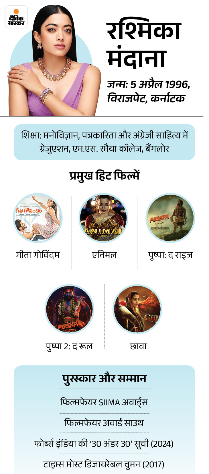 वहीं, बॉलीवुड में रश्मिका मंदाना ने ‘एनिमल’ और ‘छावा’ जैसी फिल्मों में काम किया है और वह सलमान खान की ‘सिकंदर’ में भी नजर आई हैं। रश्मिका की अपकमिंग फिल्मों में ‘थामा’ और ‘कॉकटेल 2’ शामिल हैं।