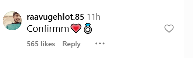 रिंग देखने के बाद फैंस बहुत खुश हुए। कई लोगों ने उन्हें बधाई दी और कहा कि एक्ट्रेस की सगाई कंफर्म हो गई है। एक यूजर ने लिखा, “सगाई कंफर्म।” दूसरे ने कहा, “आखिर रिंग मिल गई।” एक अन्य ने लिखा, “पूरा वीडियो तो सिर्फ रिंग दिखाने के लिए है।”
