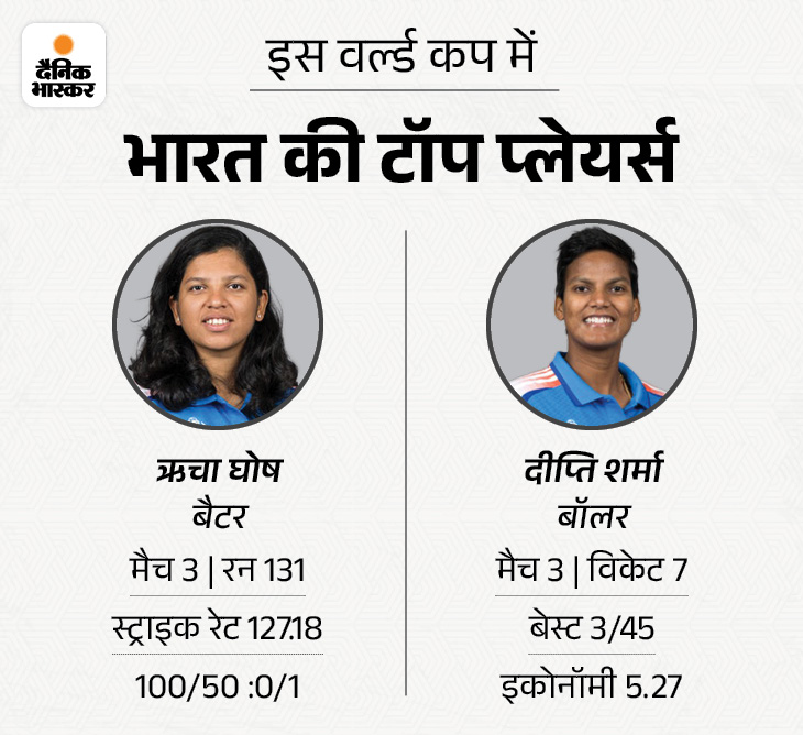 दीप्ति टीम की टॉप विकेट टेकर भारत की ऑफ स्पिनर दीप्ति शर्मा टूर्नामेंट में टीम की टॉप विकेट टेकर हैं, उन्होंने 3 मुकाबलों में 7 विकेट झटके हैं। उनके बाद क्रांति गौड़ और स्नेह राणा ने 6-6 विकेट झटके हैं। बैटर्स में ऋचा घोष ने टीम के लिए सबसे ज्यादा 131 रन बनाए हैं। उनके बाद हरलीन देओल ने 107 रन बनाए हैं।