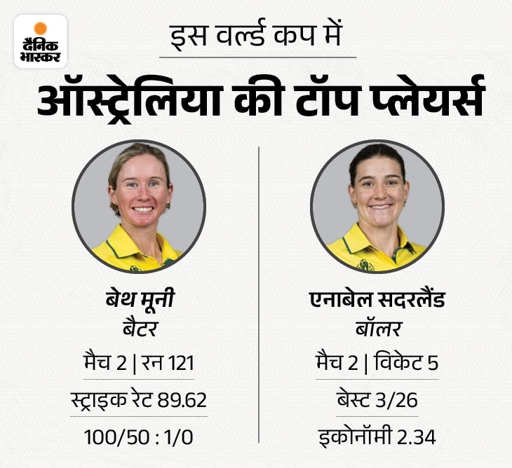 ऑस्ट्रेलियन बैटर शानदार फॉर्म में ऑस्ट्रेलिया के बैटर शानदार फॉर्म में हैं। पहले मैच में एश्ले गार्डनर ने शतक लगाया था। वहीं, पिछले मैच में पाकिस्तान के खिलाफ बेथ मूनी ने शतकीय पारी खेली थी। मूनी टीम की टॉप स्कोरर हैं। एनाबेल सदरलैंड ने टीम के लिए सबसे ज्यादा विकेट लिए हैं। उन्होंने 2 मैचों में 5 विकेट झटके।