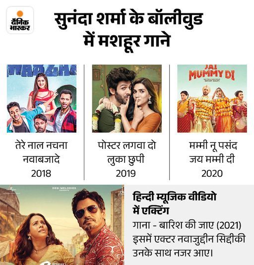सुनंदा शर्मा पंजाबी म्यूजिक इंडस्ट्री का नामी चेहरा है। उन्होंने बॉलीवुड अभिनेता नवाजुद्दीन सिद्दीकी के साथ म्यूजिक वीडियो “बारिश की जाए में” अभिनय किया था, जो काफी लोकप्रिय हुआ। इसके अलावा, सुनंदा, सलमान खान के शो बिग बॉस में भी गेस्ट बनकर जा चुकी हैं, जहां सलमान ने उनके गानों की जमकर तारीफ की थी।