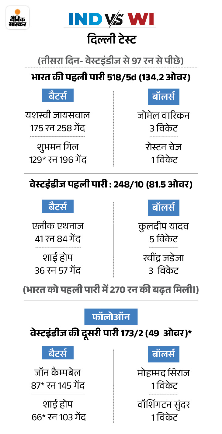 दूसरी पारी में वेस्टइंडीज का फाइटबैक भारत ने पहली पारी में 518 रन बनाए थे, इसलिए 270 रन की बढ़त के बाद वेस्टइंडीज को फॉलो ऑन दे दिया। मेहमान टीम ने दूसरी पारी में फाइट दिखाई। 2 विकेट 35 रन पर जरूर गिर गए, लेकिन जॉन कैम्पबेल और शाई होप ने फिफ्टी लगा दी। दोनों ने सेंचुरी पार्टनरशिप भी कर ली।