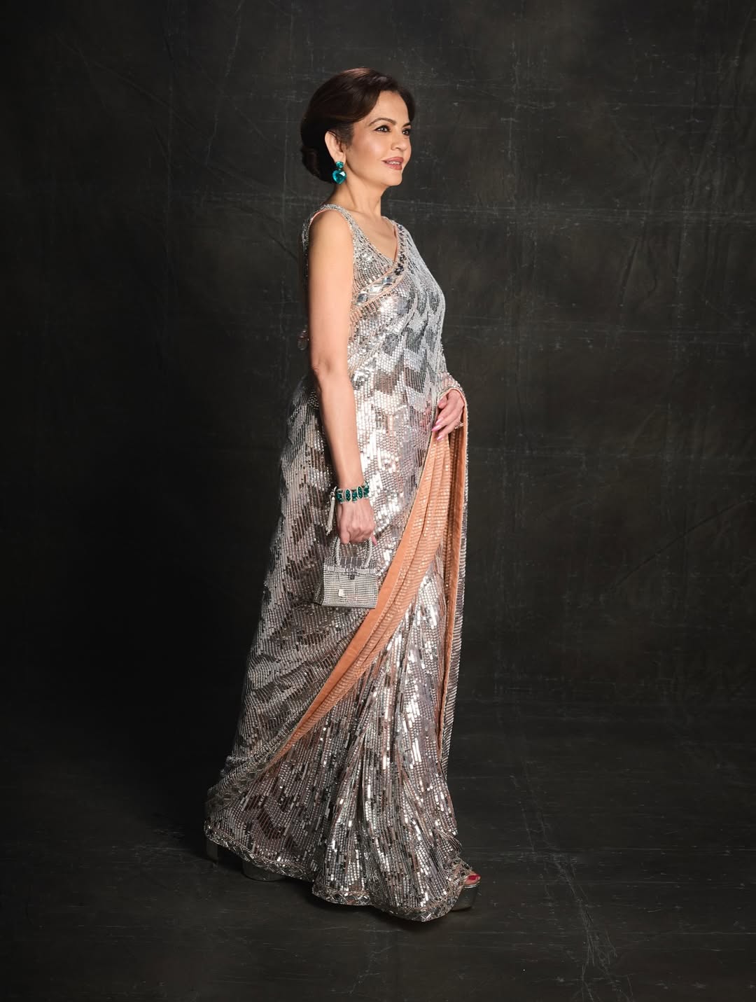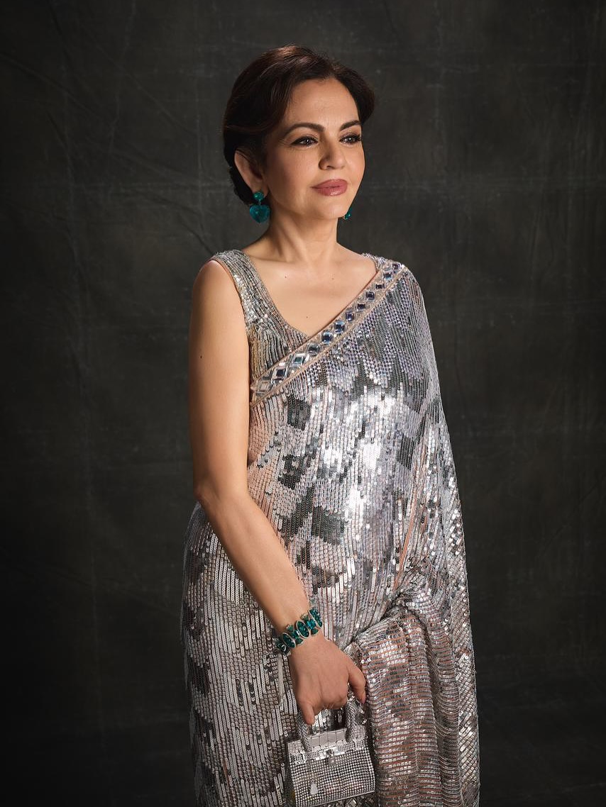नीता अंबानी ने मनीष मल्होत्रा द्वारा डिजाइन की गई सिग्नेचर सिल्वर सीक्वेन साड़ी पहनी थी। इस साड़ी पर बारीक शेवरॉन डिटेलिंग थी, जो इसे और भी खूबसूरत बना रही थी। अपने लुक को कॉम्प्लिमेंट करने के लिए उन्होंने हार्ट शेप्ड कोलंबियाई पन्ना वाले झुमके और उससे मेल खाता हुआ पन्ना और हीरे का ब्रेसलेट पहना था। इसके साथ ही उन्होंने हर्मीस का एक स्पेशल एडिशन मिनी बिर्किन बैग कैरी किया था, जिसकी कीमत लगभग 15 करोड़ रुपए है।