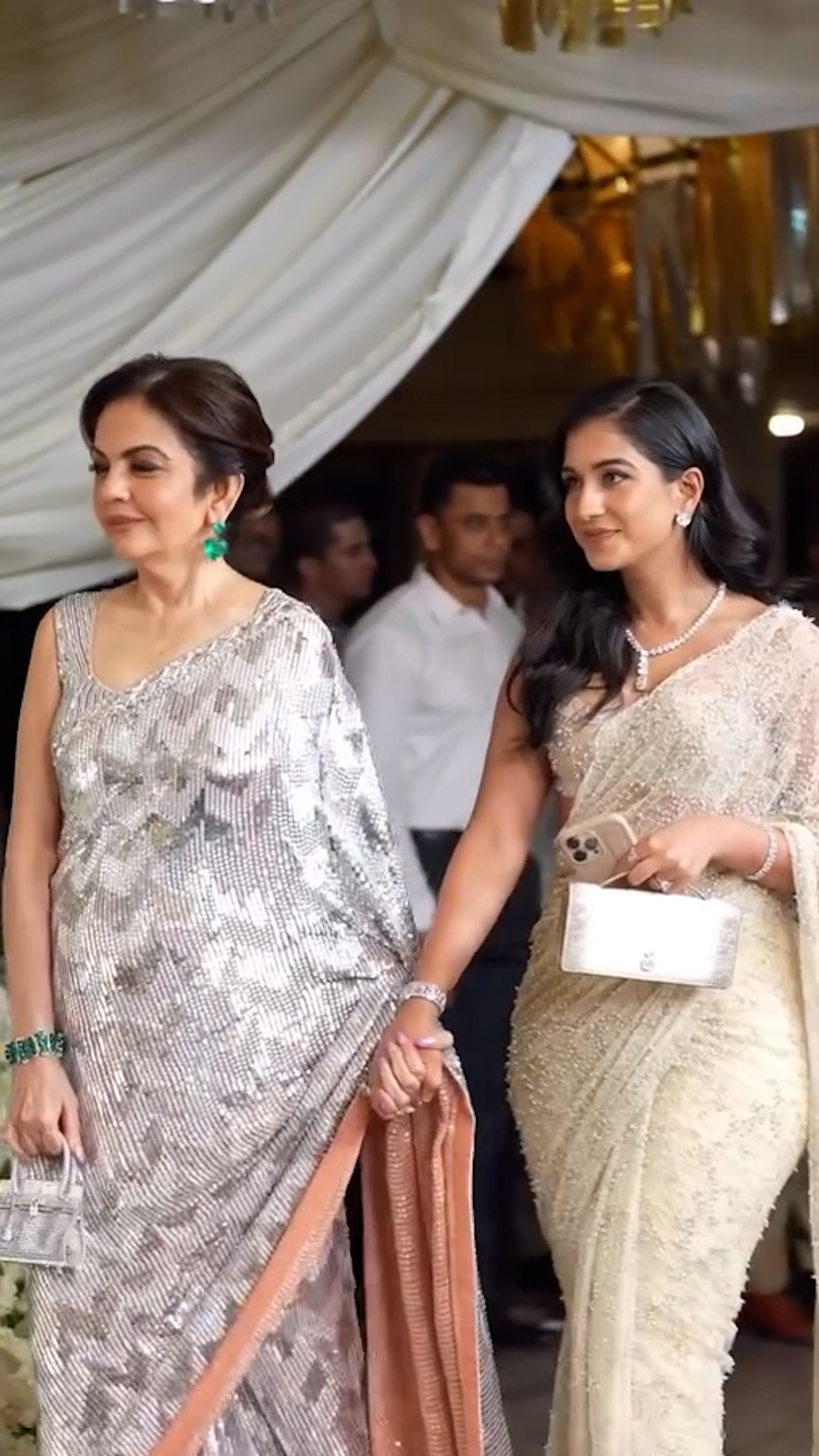 वहीं, नीता अंबानी की बहू राधिका भी ऑफ वाइट साड़ी में बेहद खूबसूरत लगीं। राधिका की साड़ी शीयर फैब्रिक की थी, जिसे मोतियों से सजाया गया था।
