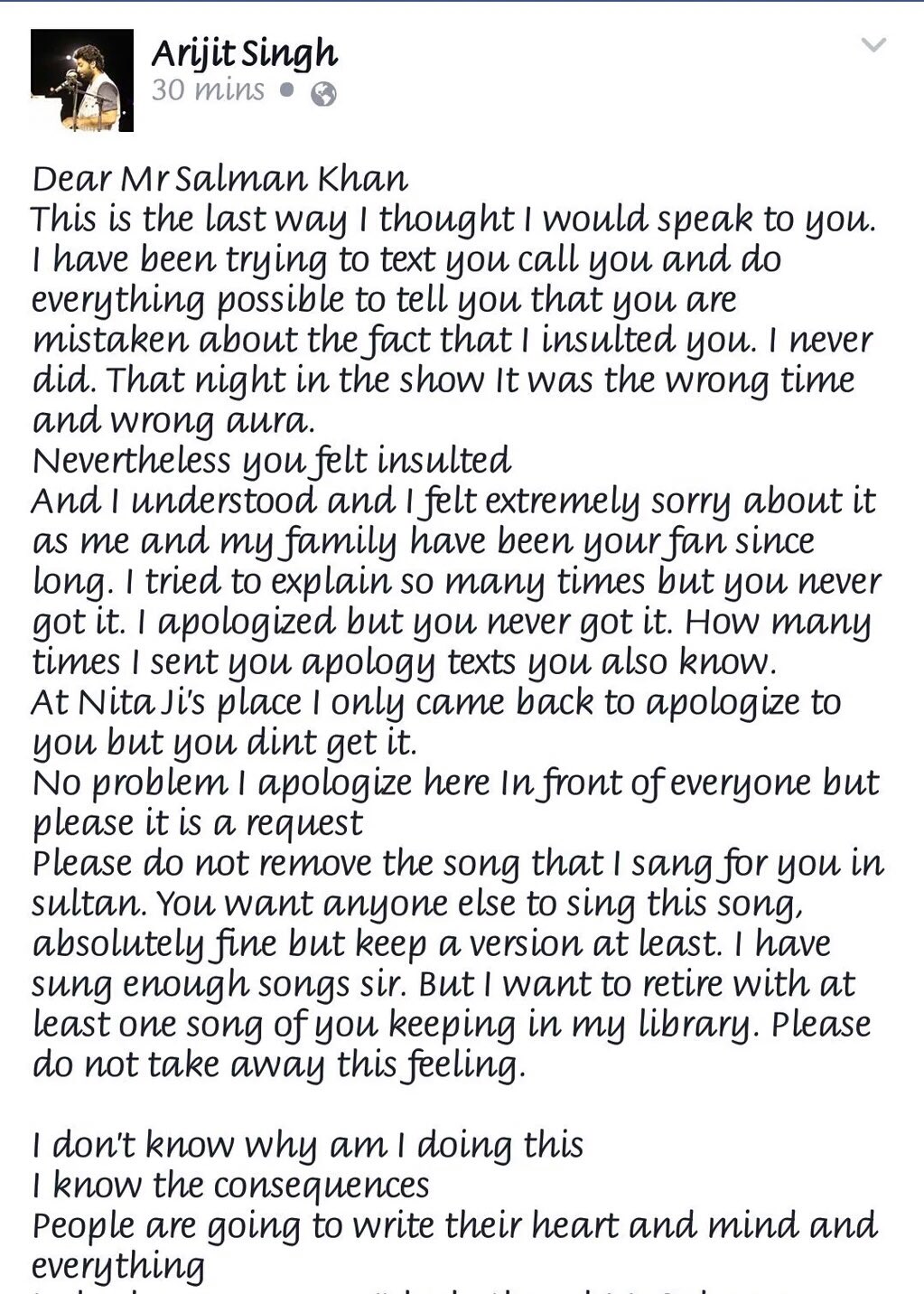 इस अनबन के समय अरिजीत सिंह ने सलमान खान की फिल्म सुल्तान के लिए गाना गाया था, लेकिन कुछ दिनों बाद ही फिल्म से उनका गाना हटा दिया गया। खबर मिलने के बाद अरिजीत सिंह ने सोशल मीडिया पर पोस्ट कर सलमान से माफी मांगी और वितनी की कि उनका गाना फिल्म से न हटाया जाए। हालांकि माफी का कोई असर नहीं हुआ।