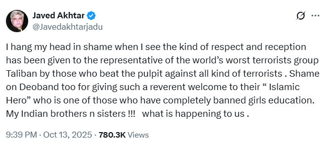 अफगानिस्तानी विदेश मंत्री आमिर खान मुत्तकी 9 अक्टूबर से 16 अक्टूबर तक भारत दौरे पर हैं। वो शनिवार को उत्तरप्रदेश के सहारनपुर स्थित दारुल उलूम देवबंद पहुंचें, जहां उनका भव्य स्वागत किया गया था। ये देखकर पॉपुलर लिरिक्स राइटर जावेद अख्तर भड़क गए हैं। उन्होंने कहा कि ये देखकर शर्म महसूस होती है कि दुनिया के सबसे खतरनाक आतंकी संगठन तालिबान के प्रतिनिधी का सम्मान के साथ स्वागत किया जा रहा है।