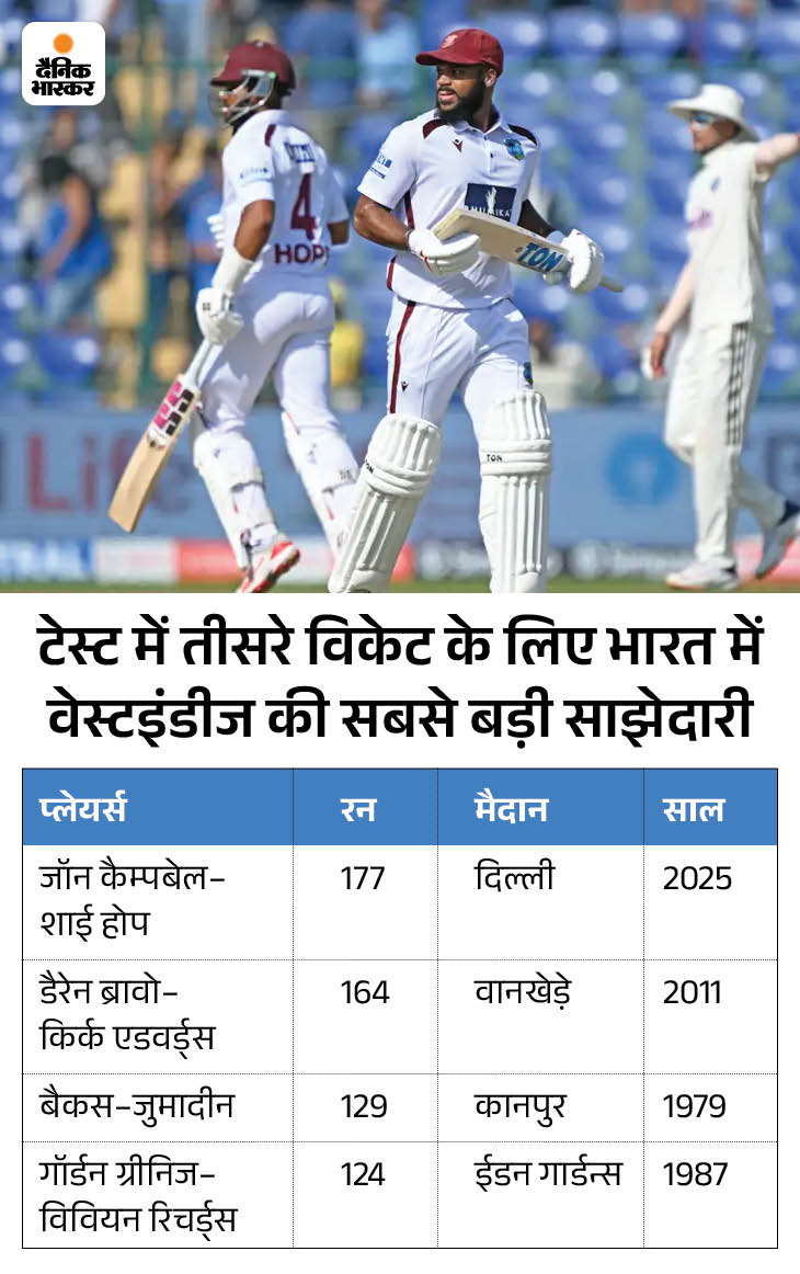 6. कैम्पबेल-होप ने 14 साल पुराना रिकॉर्ड तोड़ा भारत में टेस्ट क्रिकेट में तीसरे विकेट के लिए वेस्टइंडीज की सबसे बड़ी साझेदारी जॉन कैम्पबेल और शाई होप के नाम हो गई है। दिल्ली में कैम्पबेल और होप ने 177 रन जोड़े। उन्होंने 14 साल पुराना डैरेन ब्रावो और किर्क एडवर्ड्स के रिकॉर्ड को तोड़ा। दोनों ने 2011 वानखेड़े स्टेडियम में 164 रनों की साझेदारी की थी।