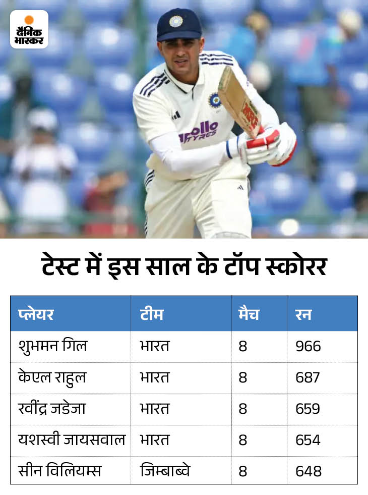 3. बल्लेबाजी में शुभमन गिल पहले से टॉप पर भारत के शुभमन गिल 2025 के टॉप टेस्ट बल्लेबाजों की लिस्ट में पहले से नंबर-1 हैं। इस साल गिल के 8 टेस्ट मैचों से 966 रन हो गए हैं। दूसरे स्थान पर मौजूद केएल राहुल के नाम 8 टेस्ट में 687 रन हैं। तीसरे और चौथे नंबर पर भी भारतीय खिलाड़ी रवींद्र जडेजा और यशस्वी जायसवाल हैं।