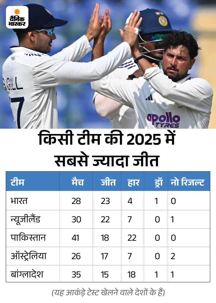 4. 2025 में सबसे ज्यादा मैच जीतने का रिकॉर्ड वेस्टइंडीज के खिलाफ दिल्ली टेस्ट में मिली जीत 2025 में इंटरनेशल क्रिकेट में टीम इंडिया की 23वीं जीत है। भारत ने इसके साथ ही न्यूजीलैंड को पीछे छोड़ दिया है। न्यूजीलैंड ने इस साल 22 मैचों में जीत हासिल की है। भारत ने इस साल टेस्ट क्रिकेट में 4, वनडे में 8 और टी-20 में 11 मैच जीते हैं। टी-20 में भारत ने 10 मैच आउटराइट जीते जबकि 1 मैच में सुपर ओवर में जीत मिली।