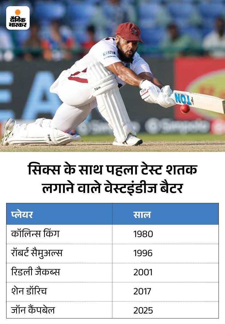8. जॉन कैम्पबेल ने छक्का लगाकर पूरा किया पहला टेस्ट शतक जॉन कैम्पबेल ने पहला टेस्ट शतक छक्का लगाकर पूरा किया। वह ऐसा करने वाले वेस्टइंडीज के पांचवें बल्लेबाज बने। उनसे पहले 1980 में कॉलिन्स किंग, 1996 में रॉबर्ट सैमुअल्स, 2001 में रिडली जैकब्स और 2017 में शेन डॉरिच ऐसा कर चुके हैं।