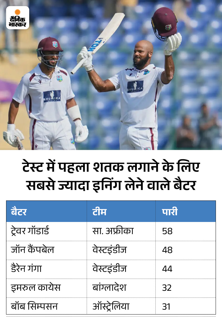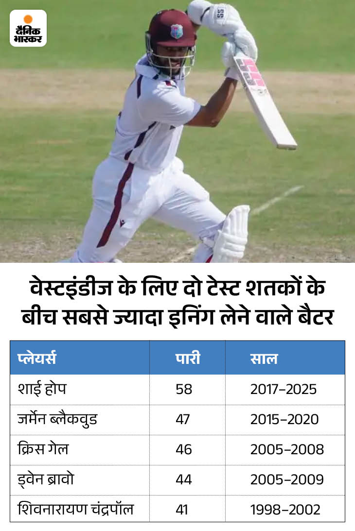 7. होप का 58 इनिंग के बाद शतक वेस्टइंडीज के बल्लेबाज शाई होप ने दो टेस्ट शतकों के बीच सबसे लंबा इंतजार करने का अनचाहा रिकॉर्ड अपने नाम कर लिया है। होप ने 2017 से 2025 के बीच अपने दो शतकों के बीच 58 पारियां खेलीं, जो वेस्टइंडीज के किसी भी खिलाड़ी के लिए सबसे बड़ा अंतर है। उन्होंने जर्मेन ब्लैकवुड 2015-2020 के बीच 47 पारियों के रिकॉर्ड को पीछे छोड़ा।