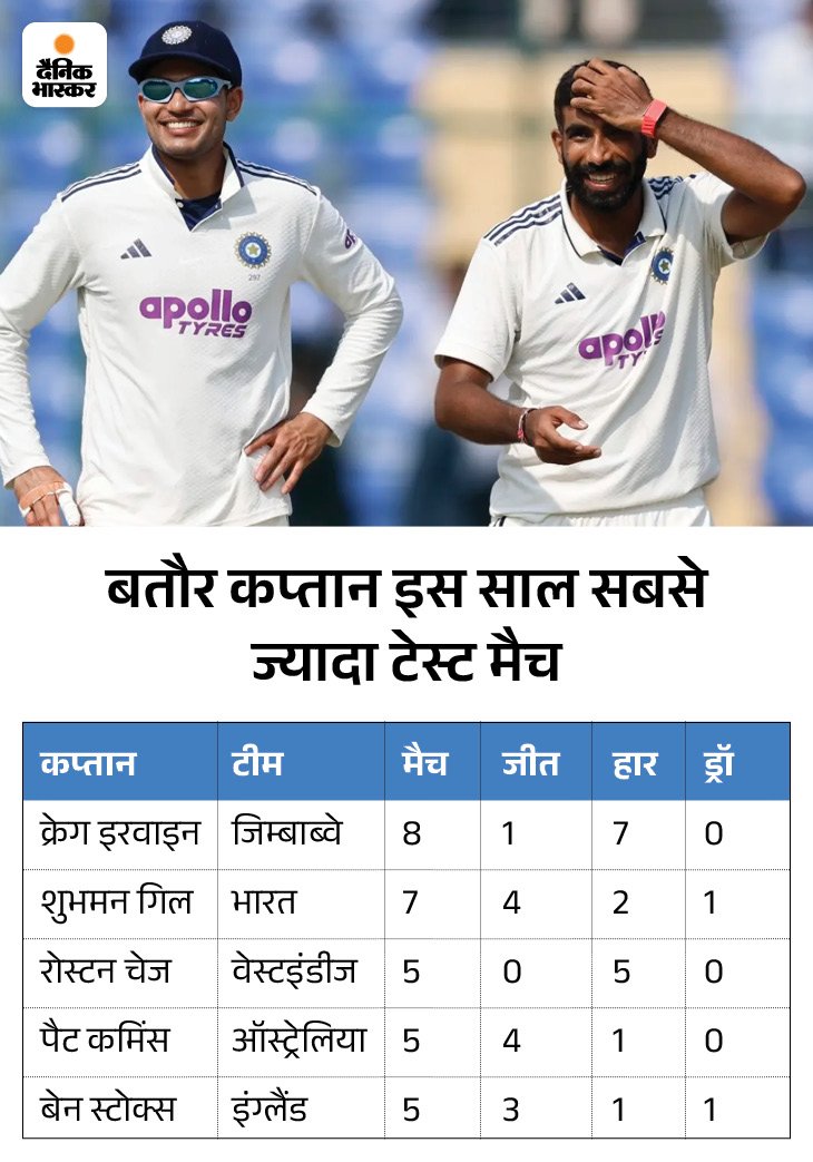 1. शुभमन गिल ने की पैट कमिंस की बराबरी शुभमन गिल की कप्तानी में इस साल भारतीय टीम ने चौथा टेस्ट मैच जीता है। गिल अब 2025 में सबसे ज्यादा टेस्ट मैच जीतने वाले कप्तानों की लिस्ट में ऑस्ट्रेलिया के पैट कमिंस की बराबरी पर आ गए हैं। कमिंस ने इस साल 5 टेस्ट में कप्तानी की है और 4 में उनकी टीम जीती। गिल ने 2025 में 7 टेस्ट में कप्तानी की और चौथी जीत हासिल की। गिल की कप्तानी में भारत 2 टेस्ट मैच हारा है और 1 मैच ड्रॉ रहा है।