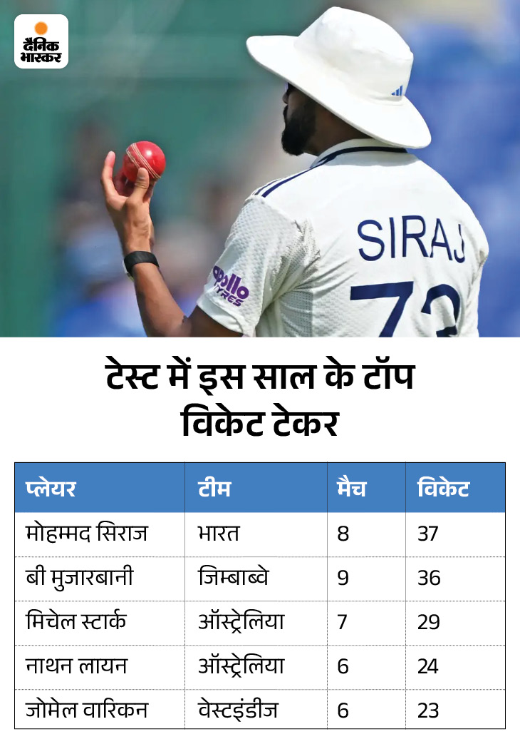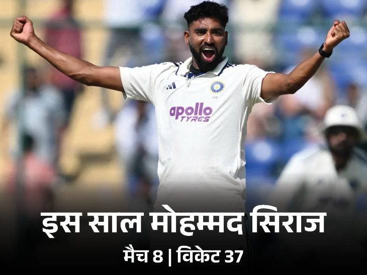 2. सिराज बने 2025 के टॉप विकेट टेकर भारतीय तेज गेंदबाज मोहम्मद सिराज 2025 में टेस्ट क्रिकेट के टॉप विकेट टेकर बन गए हैं। सिराज ने वेस्टइंडीज के खिलाफ दिल्ली टेस्ट में 3 विकेट लिए। अब उनके नाम 2025 में 8 टेस्ट मैचों में 37 विकेट हो गए हैं। उन्होंने जिम्बाब्वे के ब्लेसिंग मुजारबानी को पीछे छोड़ा है। मुजारबानी ने इस साल 9 टेस्ट में 36 विकेट लिए हैं।