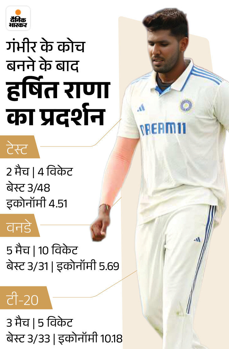 दिल्ली के तेज गेंदबाज हर्षित राणा ने पिछले साल गंभीर के मुख्य कोच बनने के बाद तीनों फॉर्मेट में डेब्यू किया है। उन्होंने दो टेस्ट, पांच वनडे और तीन टी-20 इंटरनेशनल मैच खेले हैं। जबकि भारतीय टीम ने गंभीर की कोचिंग में 7 टेस्ट, 11 वनडे और 25 टी-20 मैच खेले हैं।