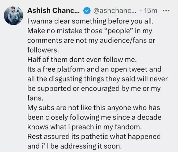 जिस पर जवाब देते हुए आशीष ने कहा था, “मैं साफ करना चाहता हूं। ये लोग मेरे असली फॉलोअर या फैंस नहीं हैं। कई लोग मुझे फॉलो भी नहीं करते। यह ओपन प्लेटफॉर्म है। मैं या मेरे फैंस किसी भी बुरी या गंदी बातें सपोर्ट नहीं करते।”