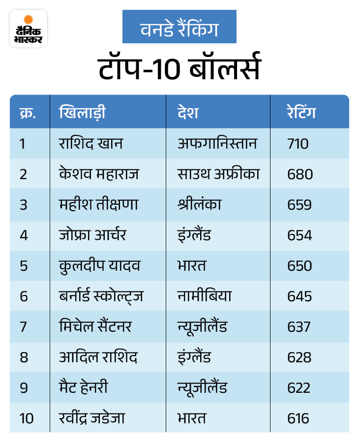 राशिद खान वनडे के नंबर-1 गेंदबाज बने गेंदबाजों की रैंकिंग में टेस्ट के टॉप-10 बॉलर्स की सूची में कोई बदलाव नहीं हुआ है। वनडे रैंकिेंग में राशिद खान 710 अंक लेकर दुनिया के नंबर-1 गेंदबाज बन गए हैं। इससे साउथ अफ्रीका के केशव महाराज (680 अंक), श्रीलंका के महीश तीक्षणा (659 अंक), इंग्लैंड के जोफ्रा आर्चर (654 अंक) और भारत के कुलदीप यादव (650 अंक) को एक-एक स्थान का नुकसान हुआ है। टी-20 बॉलर्स के टॉप-10 में चेंज नहीं हुआ।