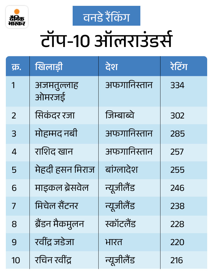 ओमरजई वनडे के टॉप ऑलराउंडर बने अफगानिस्तान के अजमतुल्लाह ओमरजई वनडे के नंबर-1 ऑलराउंडर बन गए हैं। उन्हें एक स्थान का फायदा हुआ है। ओमरजई के 334 रेटिंग पॉइंट हैं। राशिद खान (257 अंक) भी दो पायदान के फायदे के साथ चौथे नंबर पर आ गए हैं। जिम्बाब्वे के सिकंदर रजा (302 अंक) दूसरे और अफगानिस्तान के मोहम्मद नबी (285 अंक) तीसरे स्थान पर हैं।
