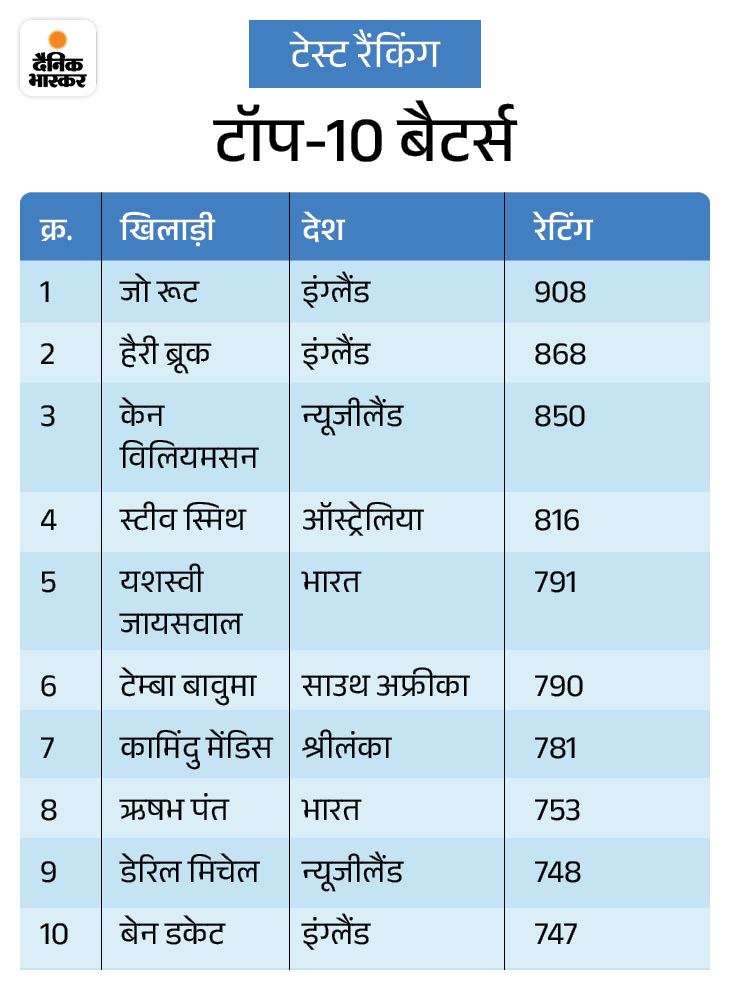 जायसवाल ने बावुमा और मेंडिस पीछे छोड़ा टेस्ट बैटर्स की रैंकिंग में भारतीय ओपनर जायसवाल ने साउथ अफ्रीका के कप्तान टेम्बा बावुमा और श्रीलंकाई बैटर कुसल मेंडिस को पीछे छोड़ा है। टॉप-10 की लिस्ट में ऋषभ पंत (753 अंक) दूसरे भारतीय हैं। वे आठवें पायदान पर हैं। इंग्लिश बैटर जो रूट 908 रेटिंग पॉइंट्स के साथ दुनिया के नंबर-1 बल्लेबाज बने हुए हैं।