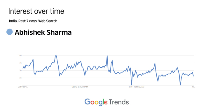 गूगल पर ट्रेंड कर रहे अभिषेक शर्मा सितंबर में एशिया कप परफॉर्मेंस के बाद से ही अभिषेक शर्मा गूगल पर ट्रेंड कर रहे हैं। इसी महीने उनकी बहन की शादी भी ट्रेंडिंग टॉपिक रही। अब ICC प्लेयर ऑफ द मंथ अवॉर्ड जीतने के बाद उन्हें इंटरनेशनल और भी ज्यादा सर्च किया जा रहा है। नीचे देखें गूगल ट्रेंड्स…