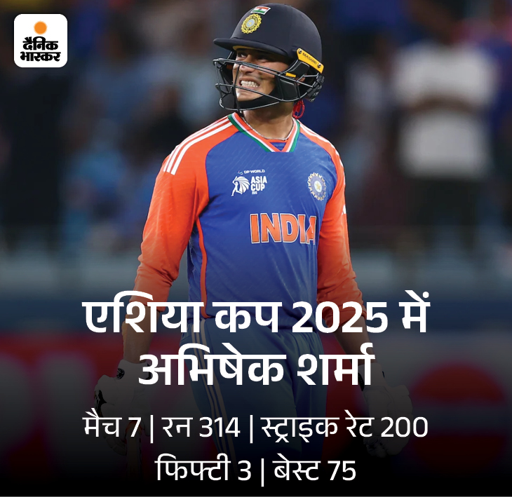 एशिया कप में पाकिस्तान के खिलाफ फिफ्टी लगाई एशिया कप 2025 में चैंपियन टीम इंडिया ने 7 मैच खेले। 6 मुकाबलों में अभिषेक शर्मा ने 30 से ज्यादा रन बनाए। 3 बार उन्होंने फिफ्टी भी लगाईं। इनमें पाकिस्तान के खिलाफ सुपर-4 स्टेज के मैच में 74 और बांग्लादेश के खिलाफ 75 रन की पारी भी शामिल रहीं। टूर्नामेंट में सबसे ज्यादा रन बनाने के साथ उन्होंने सबसे ज्यादा बाउंड्री भी लगाईं। उनका स्ट्राइक रेट 200 का रहा।