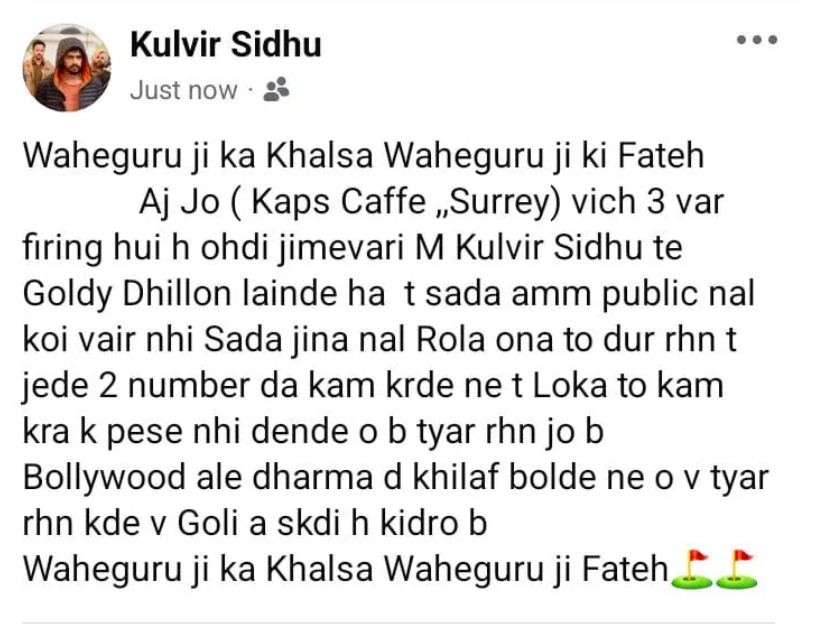 तब लॉरेंस गैंग से जुड़े गोल्डी ढिल्लो का एक पोस्ट वायरल हुआ था, इसमें वह कपिल के कैफे पर फायरिंग की जिम्मेदारी ली गई थी।