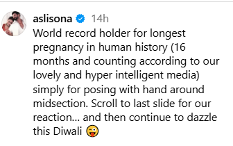 रमेश तौरानी की दिवाली पार्टी की तस्वीरें शेयर करते हुए उन्होंने इंस्टाग्राम पर लिखा, “मानव इतिहास में सबसे लंबी प्रेग्नेंसी का वर्ल्ड रिकॉर्ड मेरे नाम है (16 महीने पूरे हो गए हैं, हमारी समझदार मीडिया के हिसाब से)। ये सब सिर्फ इसलिए क्योंकि मैंने पेट पर हाथ रखकर पोज दिया था। आखिरी स्लाइड तक स्क्रॉल करें और हमारा रिएक्शन देखें… फिर इस दिवाली बस चमकते रहिए!”