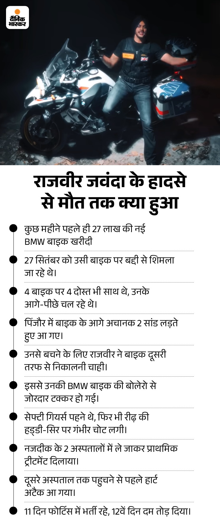 बता दे किं 27 सितंबर को राजवीर बद्दी से शिमला जा रहे थे। वह पांच दोस्तों के साथ थे और सभी अपनी-अपनी बाइक पर सवार थे। पिंजौर के पास उनकी बाइक एक गाय से टकरा गई, जिससे वह गिर पड़े। लोगों ने उन्हें तुरंत अस्पताल पहुंचाया, लेकिन उन्हें बचाया नहीं जा सका। उनकी मौत को लेकर अब हाईकोर्ट में एक याचिका भी दायर की गई है।