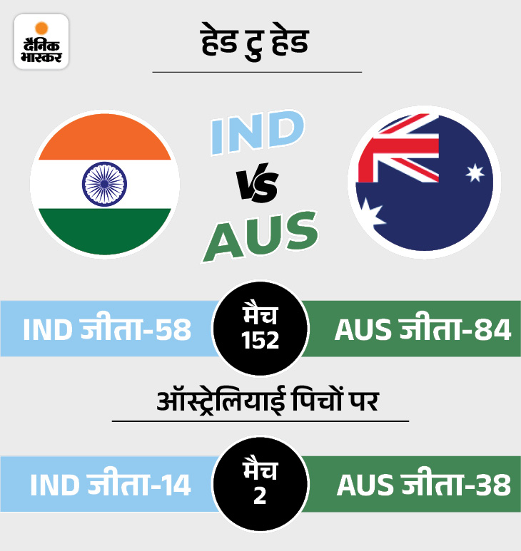 हेड-टु-हेड में ऑस्ट्रेलिया का पलड़ा भारी रहा है। टीम ने भारत के खिलाफ अब तक 152 वनडे मैच खेले हैं। इनमें से 84 में कंगारुओं ने जीत दर्ज की है, जोकि 55% है। भारत ने 58 मैच जीते हैं। 10 मैचों बेनतीजा रहे हैं। घरेलू पिचों पर ऑस्ट्रेलिया का डोमिनेंस रेट बढ़ जाता है, जोकि आंकड़ों में साफ झलकता है। भारत ने ऑस्ट्रेलिया में 54 मुकाबले खेले हैं। भारतीय टीम इसमें से सिर्फ 14 मौकों पर ही जीत सकी है। 38 मैचों में ऑस्ट्रेलिया ने अपने घर पर भारत को हराया है। 2 मैच बेनतीजा रहे हैं।
