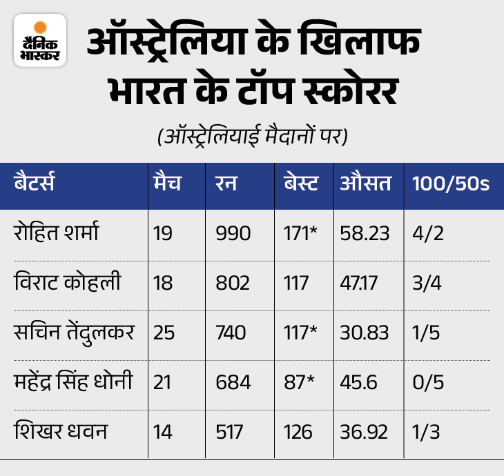 रोहित शर्मा ने ऑस्ट्रेलिया के खिलाफ उसी के घर में 990 रन बना लिए हैं। वे 10 रन बनाने के साथ 1000 रन पूरे कर लेंगे। वे ऐसा करने वाले पहले भारतीय बैटर बन जाएंगे। इस लिस्ट में विराट कोहली (802 रन) और सचिन तेंदुलकर (740 रन) तीसरे नंबर पर हैं।