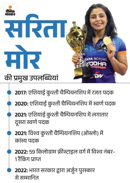 - 59 किलो भार वर्ग में वर्ल्ड नंबर-1 रहीं: सरिता मोर भारतीय महिला कुश्ती की प्रमुख चेहरों में से एक हैं। उन्होंने 2022 में विश्व रैंकिंग में 59 किलोग्राम वर्ग में नंबर-1 स्थान हासिल किया था और एशियाई चैंपियनशिप में चार पदक जीते हैं। 2021 में उन्हें अर्जुन पुरस्कार से सम्मानित किया गया था।