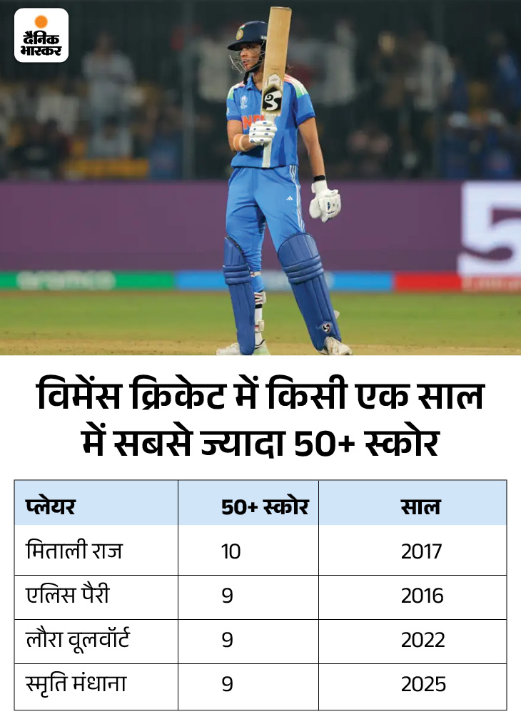 4. मंधाना ने इस साल 9वीं बार 50+ स्कोर बनाया ओपनर स्मृति मंधाना ने इस साल 9वीं बार 50+ स्कोर बनाया। वे 88 रन बनाकर आउट हुईं। मिताली राज ने 2017 में 10 बार 50+ का स्कोर बनाया था।