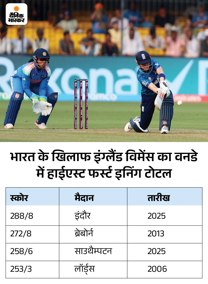 2. इंग्लैंड ने भारत के खिलाफ हाईएस्ट फर्स्ट इनिंग टोटल बनाया इंदौर में पहले बैटिंग करते हुए इंग्लैंड विमेंस ने 288 रन बनाए। यह उनका वनडे में भारत के खिलाफ हाईएस्ट फर्स्ट इनिंग टोटल रहा। इससे पहले 2013 को ब्रेबोर्न स्टेडियम में हुए मुकाबले में इंग्लैंड ने 272/8 का स्कोर खड़ा किया था। यह भारत के खिलाफ वनडे वर्ल्ड कप में किसी भी टीम का हाईएस्ट टोटल भी है। 2013 ब्रेबोर्न में श्रीलंका ने 282/5 का स्कोर बनाया था।