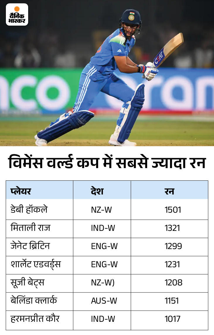 3. हरमनप्रीत विमेंस वर्ल्ड कप में हजार रन बनाने वाली दूसरी भारतीय हरमनप्रीत कौर विमेंस वर्ल्ड कप में हजार रन बनाने वाली दूसरी भारतीय बन गईं हैं। उनके अब 1017 रन हो गए हैं। भारत के लिए मितली राज ने सबसे ज्यादा 1321 रन बनाए हैं। सभी देशों की लिस्ट में न्यूजीलैंड की डेबी हॉकले नंबर-1 पर हैं। उनके नाम 1501 रन है।
