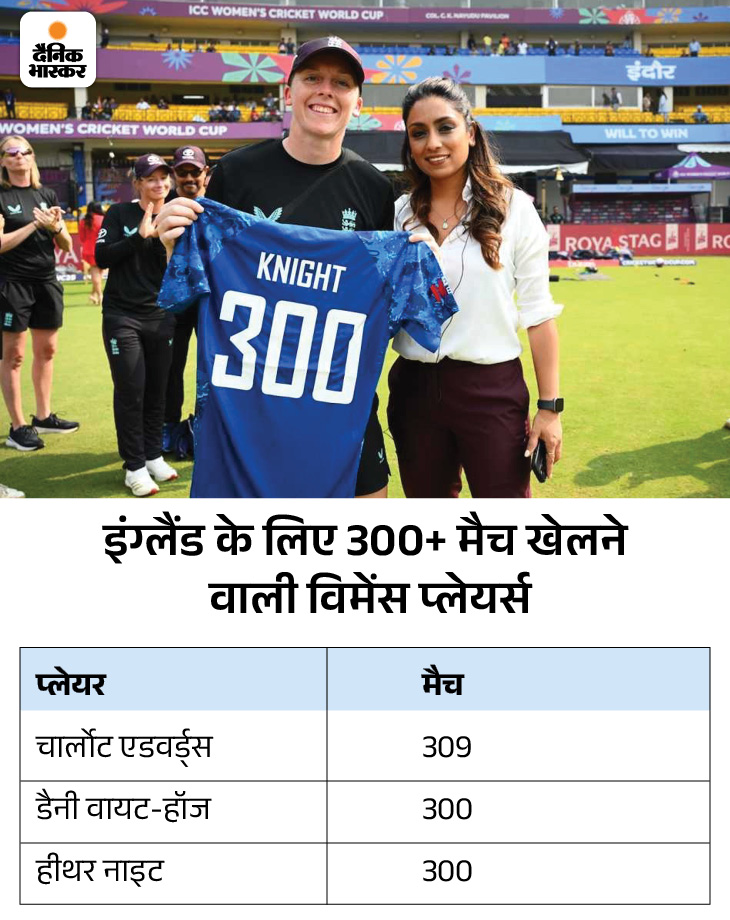 5. हीथर 300वां इंटरनेशनल मैच खेलने वालीं तीसरी इंग्लिश महिला इंग्लिश बैटर हीथर नाइट को ईशा गुहा ने उनके 300वें इंटरनेशनल मैच में स्पेशल जर्सी दी। उन्होंने मैच में शतक भी लगाया। वे इंग्लैंड की तरफ से 300 मैच खेलने वाली तीसरी ही प्लेयर बनीं। उनसे पहले चार्लोट एडवर्ड्स और डैनी वायट-हॉज ऐसा कर चुकीं हैं।