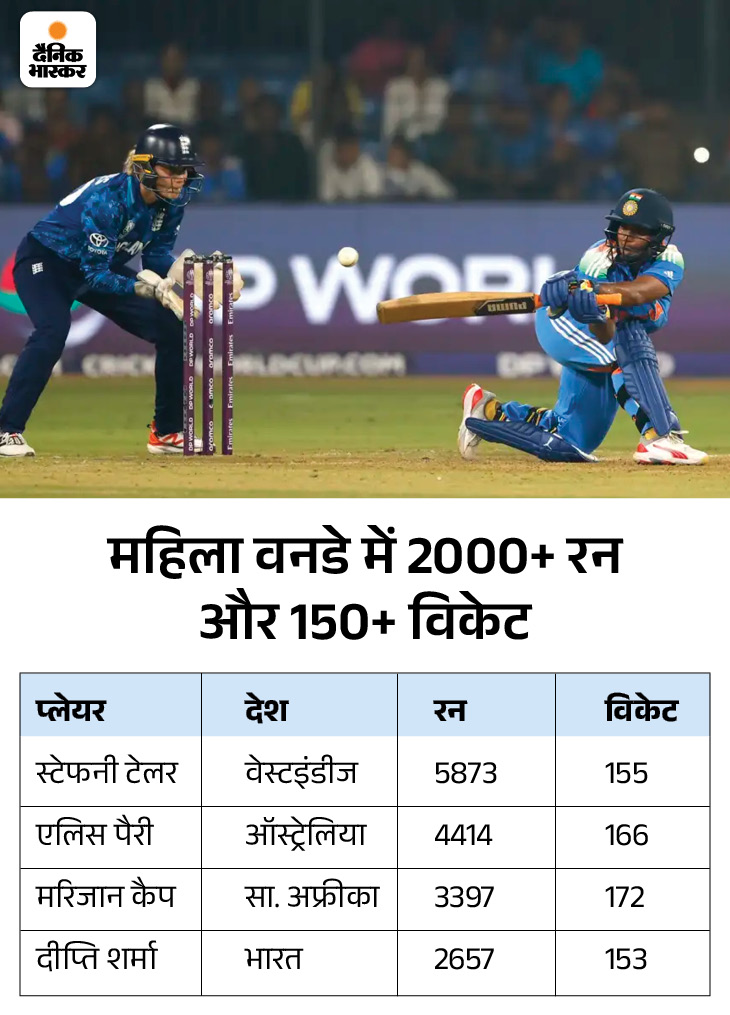 1. दीप्ति वनडे में 2000+ रन और 150+ विकेट लेने वाली चौथी महिला ऑलराउंडर दीप्ति शर्मा विमेंस वनडे में 2000 से ज्यादा रन और 150 से ज्यादा विकेट लेने वाली चौथी प्लेयर बनीं। उन्होंने इंग्लैंड के खिलाफ 4 विकेट लेने के साथ 50 रन भी बनाए। इस लिस्ट में वेस्टइंडीज की स्टेफनी टेलर टॉप पर हैं। उन्होंने 5873 रन के साथ 155 विकेट लिए हैं।
