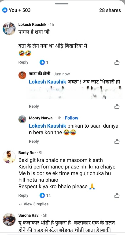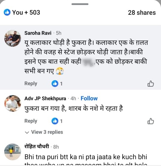 यही नहीं, इस मामले को जातीय रंग देने की भी कोशिश चल रही है। कॉस्ट को टारगेट करने वाले कमेंट शो वाली पोस्ट पर आ रहे हैं। शो के आयोजक की फेसबुक आईडी पर मासूम शर्मा के लिए अब गंदे कमेंट लिखे जा रहे हैं।