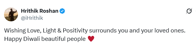 ऋतिक रोशन ने अपने ऑफिशियल X अकाउंट से लिखा है, “आप और आपके अपने लोगों के चारों ओर प्यार, रोशनी और सकारात्मकता बनी रहे। सभी खूबसूरत लोगों को हैप्पी दिवाली।”