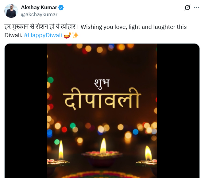 अक्षय कुमार ने भी एक तस्वीर पोस्ट कर फैंस को दिवाली की शुभकामनाएं दीं। उन्होंने इसके साथ लिखा, हर मुस्कान से रोशन हो ये त्योहार। इस दिवाली आपको मिले प्यार, रोशनी और हंसी-खुशी की सौगात। हैप्पी दिवाली।