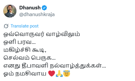 जल्द ही फिल्म तेरे इश्क में नजर आने वाले एक्टर धनुष ने अपने ऑफिशियल सोशल मीडिया अकाउंट से तमिल भाषा में दिवाली की शुभकामनाएं देते हुए लिखा है, “हर किसी के जीवन में रोशनी फैले, खुशियां बढ़ें, धन-सम्पत्ति बढ़े, मेरी दीपावली की शुभकामनाएं, ॐ नमः शिवाय”