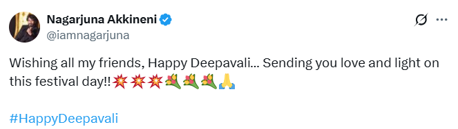 साउथ सुपरस्टार नागार्जुन ने दिवाली के खास मौके पर एक पोस्ट शेयर कर लिखा है, “मेरे सभी दोस्तों को दीपावली की शुभकामनाएं, इस त्योहार के दिन आपको भेज रहा हूं प्यार और रोशनी।”